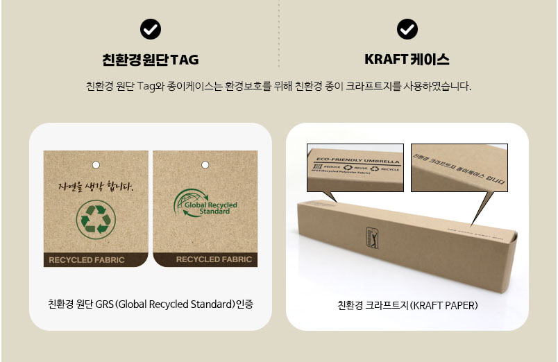친환경 그린 3단 60 완전자동우산은 제품뿐만 아니라, 패키지 포장까지 환경보호를 위해 원단 TAG와 패키지 마무리 포장을 크라프트 종이로 마무리 했습니다.