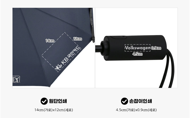 홍보 판촉 기념 답례 PGA 친환경 그린 3단 60 완전자동우산 인쇄는 원단 인쇄와 손잡이 각인 인쇄 두 옵션 중 선택이 가능하고, 원단과 손잡이 모두 인쇄를 선택하실 수도 있습니다.