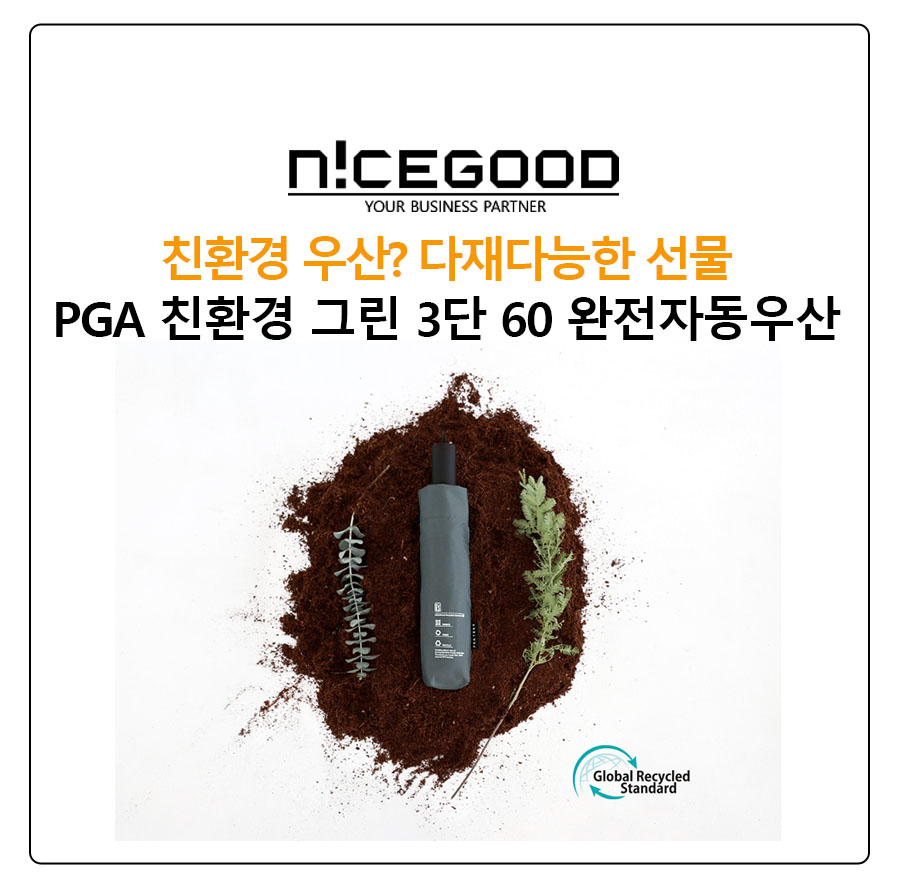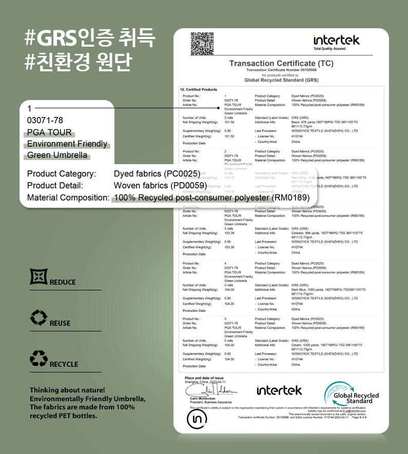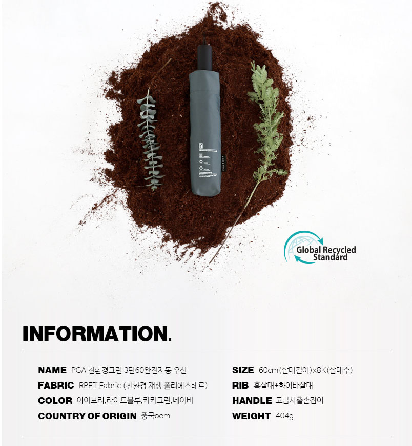 :PGA 친환경 그린 3단 60 완전자동우산 특징이라면, 원단의 소재가 GRS 소재로 제작되었다는 것입니다.