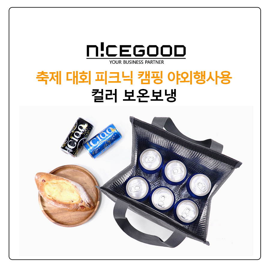 출산 기념 축제 대회 피크닉 캠핑 야외행사 홍보용 컬러 보온보냉백의 겉감 소재는 옥스퍼드 소재로 되어 있고 안감은 알루미늄 단열재로 제작되어 견고함과 기능성을 모두 갖춘 보온보냉 가방입니다.