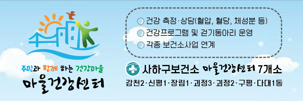 부산 사하구보건소 마을건강센터 홍보스티커 2차 시안은 하늘 부분을 더 넓게 배경에 적용했고, 오히려 하늘 부분만 배경으로 하는 것이 어떨까 하는 보건소 주무관님의 요청에 따라,