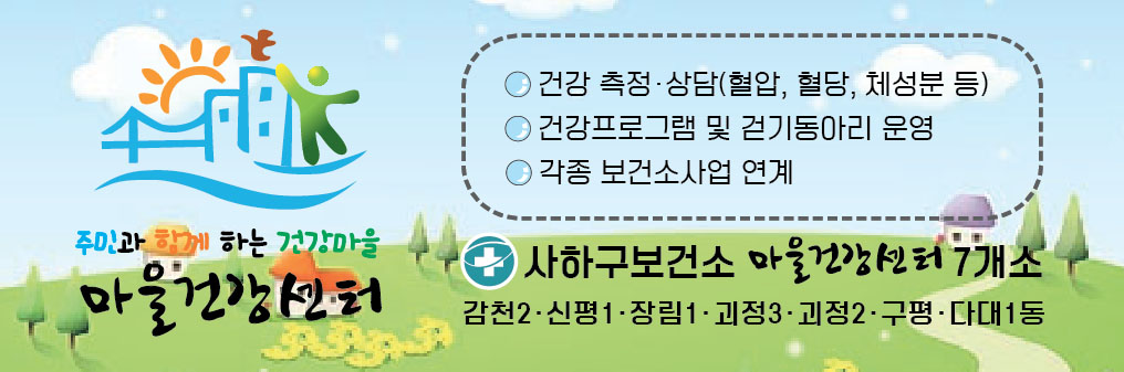 부산 사하구보건소 마을건강센터 기존 홍보스티커는 굳이 흰색 테두리를 하지 않아도 되는 내용에 테두리를 적용해서 오히려 시인성, 가독성을 더 떨어뜨리는 디자인이어서, 위와 같이 보건소 마크를 제외하고는 흰색 테두리를 적용하지 않았습니다.