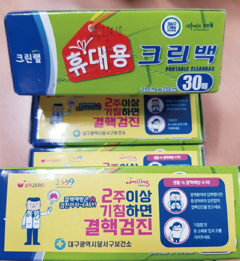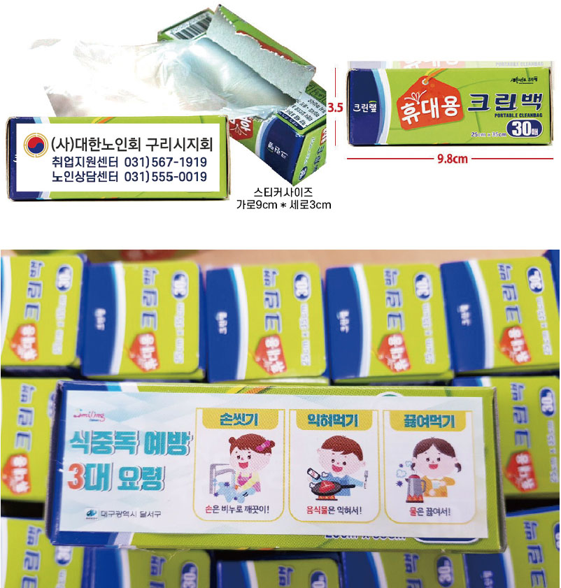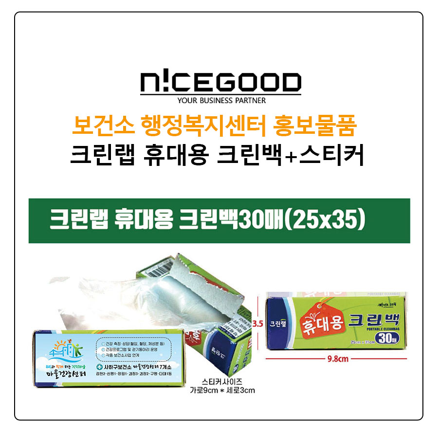 보건소 행정복지센터 홍보물품 크린랩 휴대용 크린백 스티커 부착 제품은 주로 보건소나 보건행정 복지센터 등에서 의뢰가 많은 제품이며,