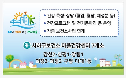 마을건강센터는 주민들의 건강수준을 향상시키고 지역간 건강격차를 줄이는 것이 목표입니다. 부산 시민은 누구나 건강할 권리가 있답니다. 마을마다 건강수준이 달라서는 안되겠지요? 그동안 보건소가 멀어서 겪었던 불편을 없애고 누구나 집 근처에서 건강상담을 받을 수 있고, 이웃도 사귀며 건강공동체를 만들어 가는곳. 바로 마을건강센터입니다.