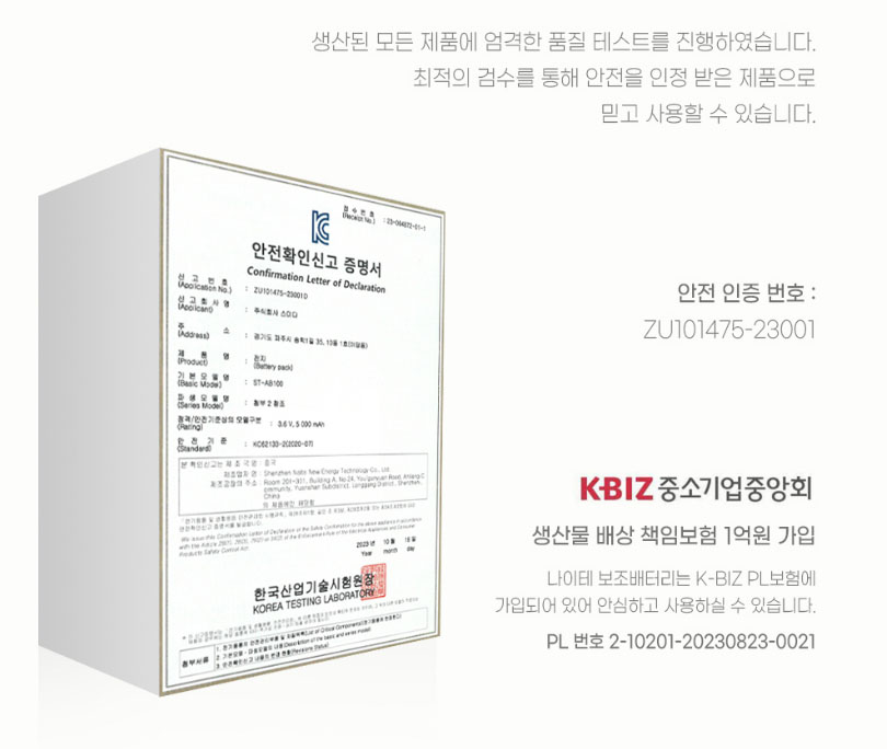 또한 K-BIZ 중소기업중앙회의 생산물 배상 책임보험 1억원 가입 제품으로 안심하고 사용하셔도 됩니다.