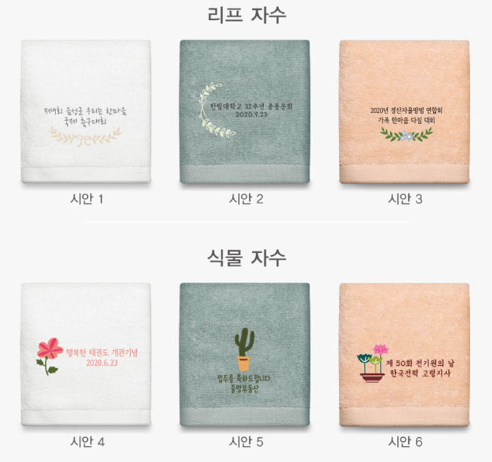 기업 행사 축제 주문제작용 캘리그라피 자수 타월과 함께 모든 자수 가능 수건에 적용이 가능한 300여 가지 이상의 디자인을 보유중인 공장에서 직접 자수를 진행하고 있습니다.