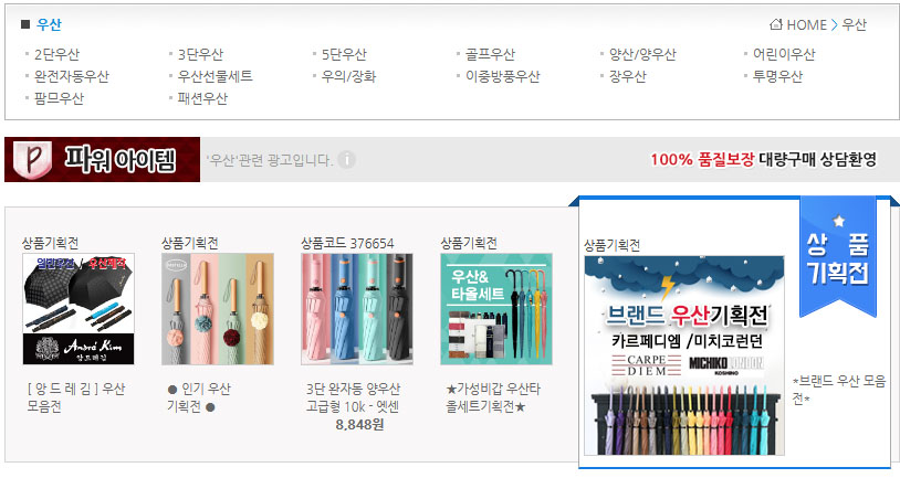 위의 이미지를 클릭하시면 나이스굿에서 제작 가능한 2단, 3단, 5단 및 골프우산, 우양산, 어린이우산, 투명우산, 방풍우산 등 국내에서 유통되는 모든 우산을 선택해서 진행하실 수 있습니다.