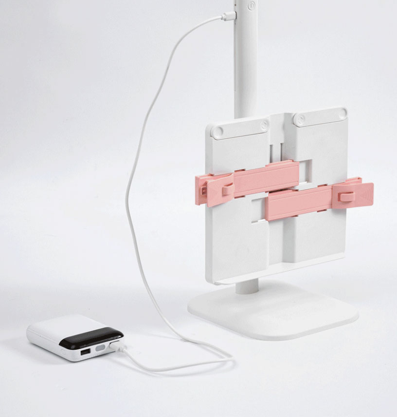 도서관의 날 독서실 학원 홍보 마케팅 만능 무선 LED스탠드 독서대 거치대 디자인 중 상단은 접이식 헤드와 함께 전원 스위치와 충전포트가 있으며, 다소 크고 무거운 책도 지탱할 수 있도록 별도 날개가 추가로 제공됩니다.
