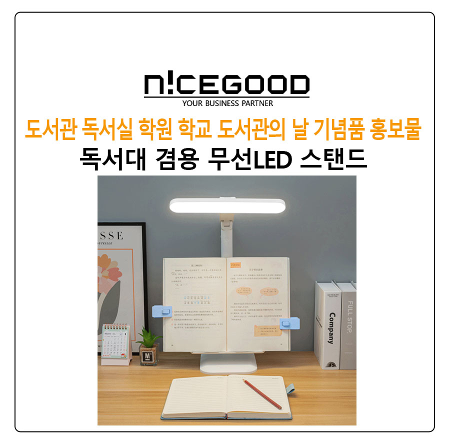 도서관의 날 독서실 학원 홍보 마케팅 만능 무선 LED스탠드 독서대 거치대는 3가지의 조도조절 기능과 높이 조절, 헤드 탈거 후 태블릿 거치대나 순수 독서대로 활용 등으로 지저분한 책상을 이 제품 하나로 완벽하게 정리할 수 있는 아이디어 상품입니다.