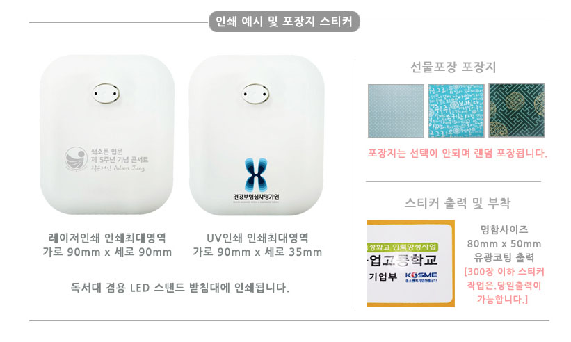 도서관 독서실 학원 학교 도서관의 날 기념품 홍보물 독서대 겸용 무선 LED 스탠드 인쇄는 스탠드 받침대에 레이저 각인이나 UV컬러인쇄가 가능해, 단체나 기관, 행사, 축제 홍보물이나 선물로 활용이 가능하고, 기본케이스에 선물포장 후 스티커까지 부착이 가능해서 호불호 없는 선물, 사은품, 홍보 판촉물로 응용이 가능합니다.