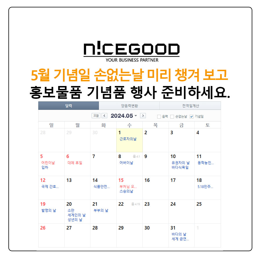 5월 공휴일 기념일 손없는날 가성비 기념품 홍보물을 준비를 하실 수 있도록 3월, 4월에 이어 5월도 정리를 해보겠습니다.