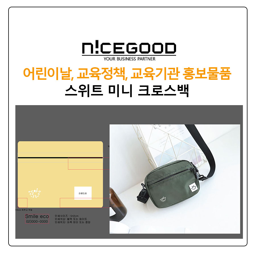 나이스굿에서 운영하고 있는 나이스판촉 온라인몰에서 스위트 미니 크로스백의 상세 안내와 가격 등을 확인하시고, 제작을 원하실 경우 견적 요청 또는 1:1 문의나 톡으로 연락 주시면 됩니다.