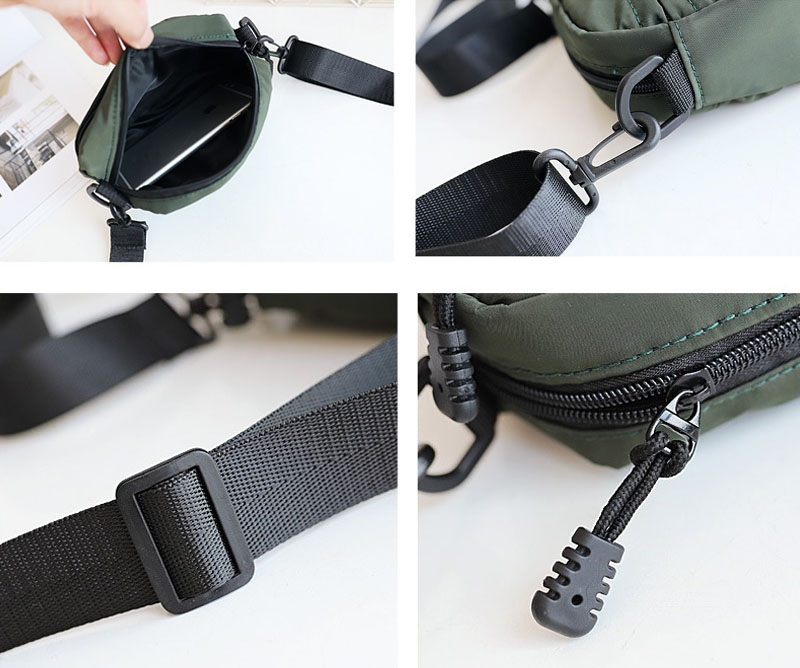 미니 크로스백이라는 특징이 잘 보이는 컴팩트한 사이즈와 튼튼한 봉재, 그리고 보조주머니 등을 통해 수납의 편의를 극대화 했으며, 작은 지퍼 손잡이를 쉽게 잡고 열도 닫을 수 있도록 손잡이 고리를 적용했습니다.