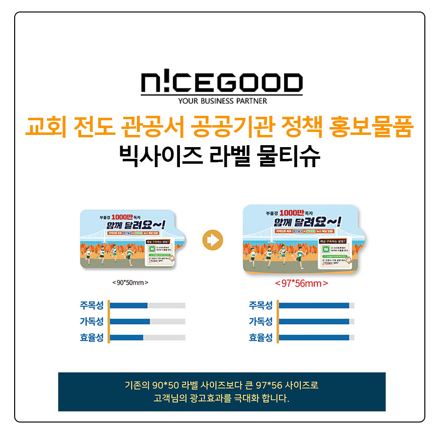 교회 전도 관공서 공공기관 정책 홍보물품 빅사이즈 라벨 물티슈는 기존의 라벨 90*50mm 보다 사이즈가 커진 97*56mm 라벨 사이즈를 적용하여 광고, 홍보 효과를 극대화한 제품입니다.