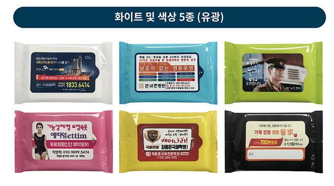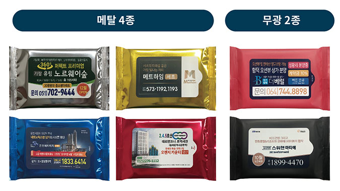 홍보 판촉 전도용 빅사이즈 라벨 물티슈의 기본 필름 포장은 일반 유광포장과 메탈 느낌의 메탈포장, 그리고 무광포장, 물방울 패턴 포장, 전도용 필름 포장 등 선택의 폭이 다양합니다.
