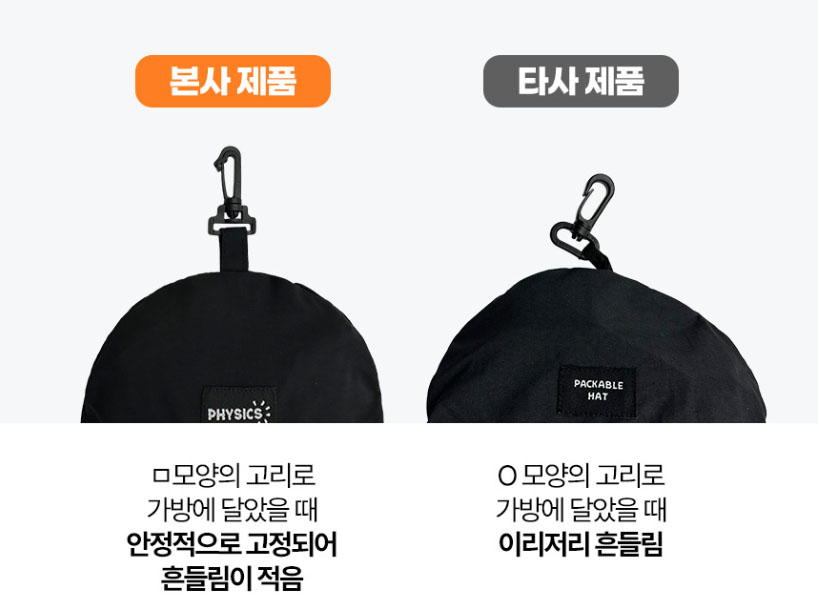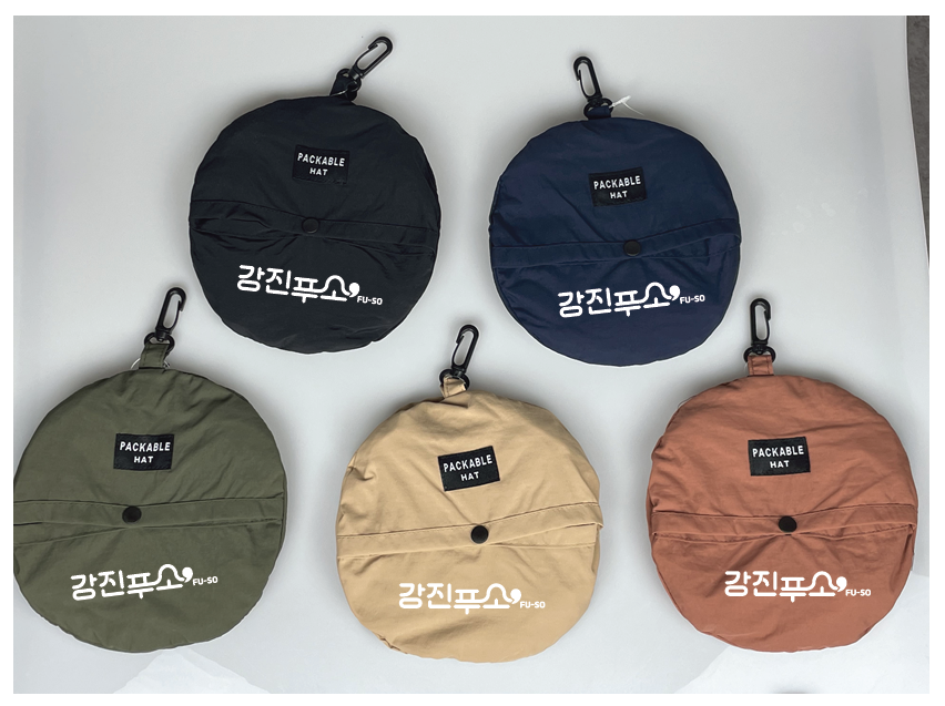 농촌 체험 여행 강진푸소 PU-SO 홍보 기념품 접이식 벙거지모자 업그레이드를 통해 기존의 O자 형태의 고리가 가방이나 자전거, 배낭 등에 결속했을 경우 흔들거림이 심해, ㅁ 자 형태의 고리로 업그레이드, 안정적으로 고정되어 흔들림을 최소화 했습니다.