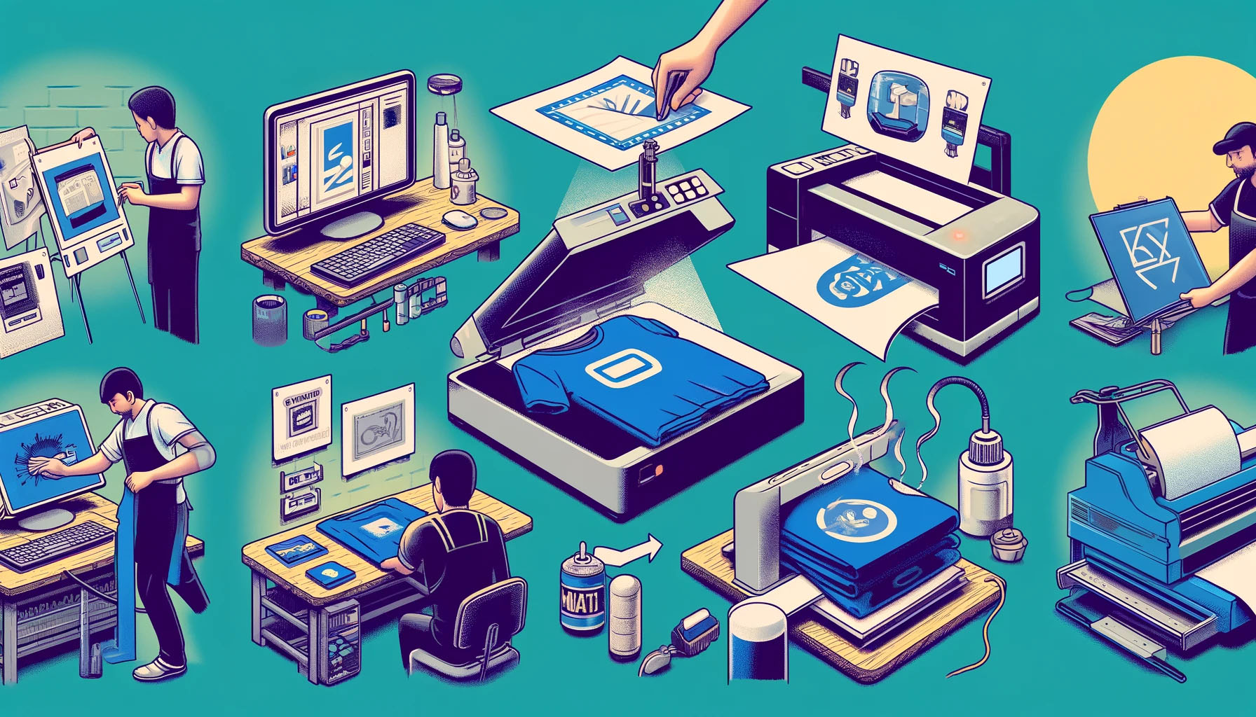 위 이미지는 전사인쇄 과정을 자세히 보여줍니다. 첫 번째 장면에서는 컴퓨터를 사용해 디자인을 생성하는 모습을 볼 수 있습니다. 두 번째 장면에서는 생성된 이미지를 전사지에 인쇄하는 과정이 표현되어 있고, 마지막 장면에서는 열 프레스 기계를 사용하여 티셔츠에 이미지를 전사하는 모습이 나타납니다. 이 과정은 전사인쇄의 기술적인 측면과 다양한 도구 및 기계 사용을 강조하고 있습니다.