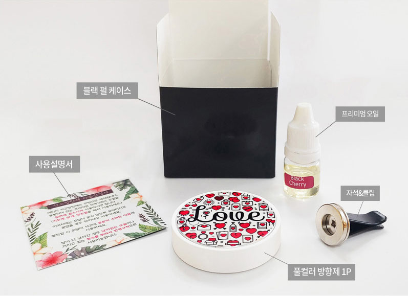 축제 마케팅 정책 보건 자동차 홍보 기념품 굿즈 차량용 석고 방향제는 블랙 펄 케이스와 풀컬러 방향제 본체, 프리미엄 오일, 자석과 송풍구 부착 클립, 사용설명서로 구성되어 있으며, 프리미엄 오일은 취향에 따라 7가지 향이 준비되어 있습니다.
