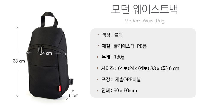 가로 세로 폭이 각각 24, 33, 6Cm로 컴펙트함과 실용성을 동시에 추구했으며, 정면에 6*5Cm 사이즈로 실크 1도 인쇄가 가능합니다.