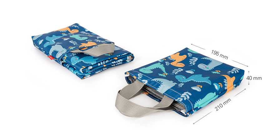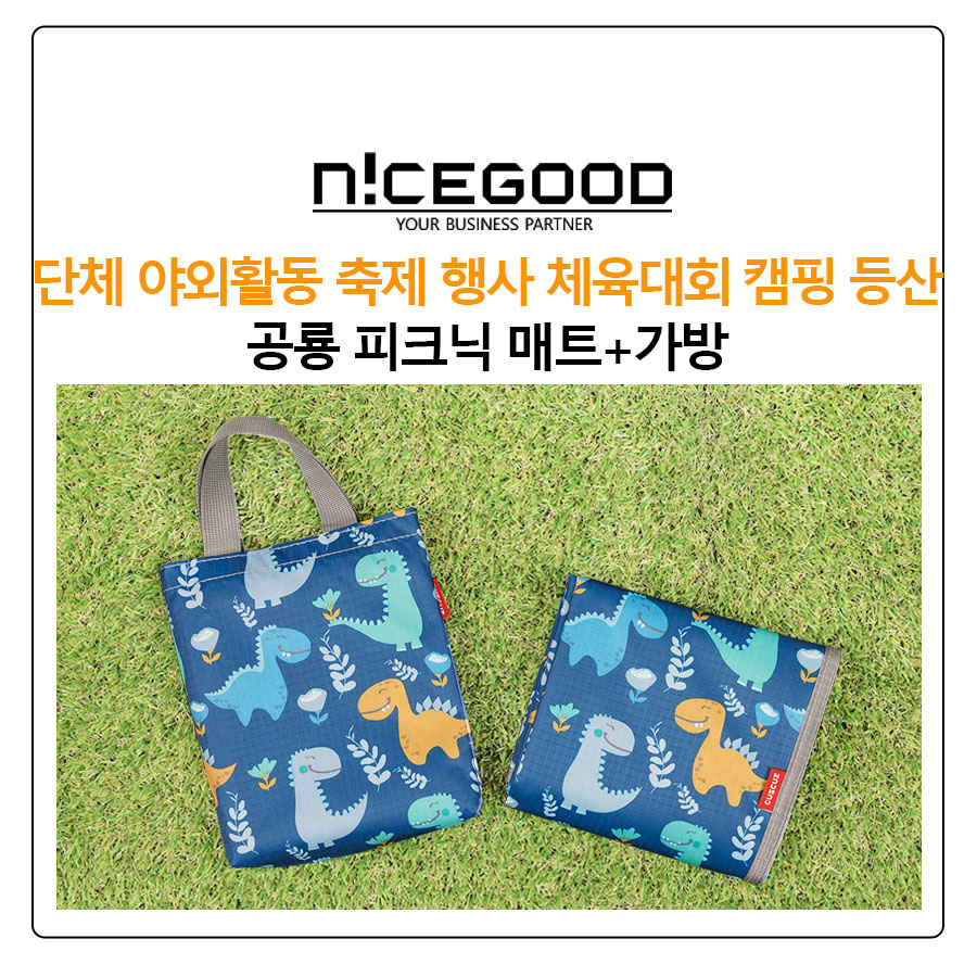 단체 야외활동 축제 행사 체육대회 캠핑 등산 공룡 피크닉 매트 가방은 매트와 가방이 세트로 구성되어 있어 보관과 이동이 용이한 제품으로 귀여운 공룡 패턴 무늬에 방수기능과 함께 휴대성을 극대화한 홍보물품, 굿즈, 판촉물, 사은품, 답례품으로 제작된 아이템입니다.