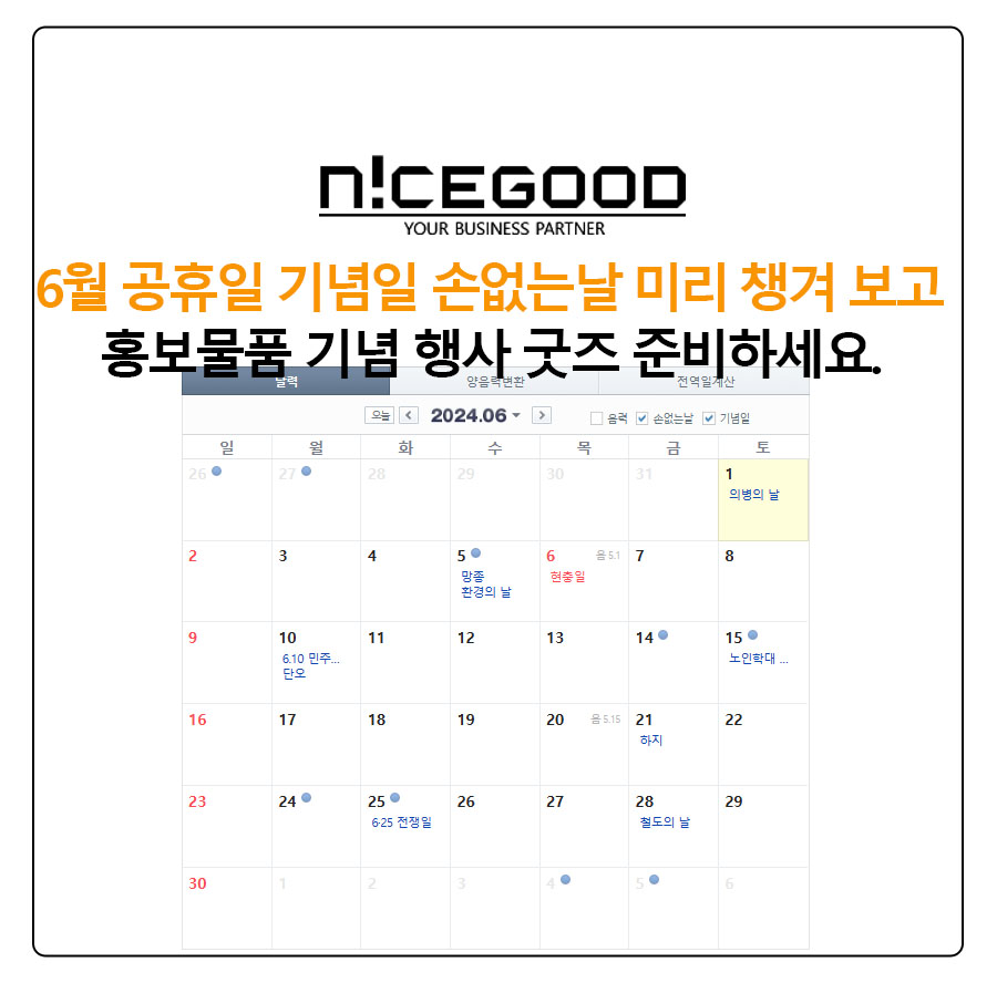 6월 공휴일 기념일 손없는날 가성비 기념품 홍보물을 준비를 하실 수 있도록 3월, 4월, 5월에 이어 6월도 정리를 해보겠습니다.