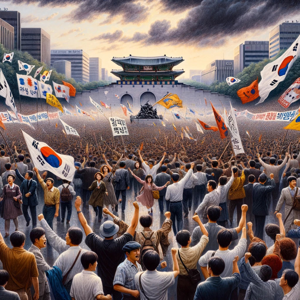 역사적 의의는 대한민국이 군사 독재 정권에서 벗어나 직접 선거를 통한 민주 정부 수립으로 나아가는 결정적 계기를 마련했다는 데 있습니다. 이는 국민의 힘으로 이루어낸 민주화의 승리를 상징하며, 현재의 민주적인 사회 구조를 누릴 수 있는 기반을 만들었습니다.