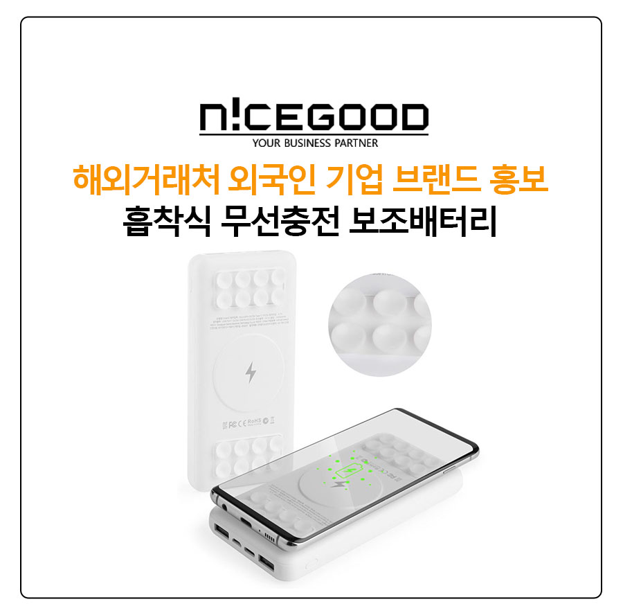 해외거래처 외국인 기업 브랜드 홍보 흡착식 무선충전 보조배터리는 스마트폰 고정 흡착패드로 무선 충전 시 스마트폰과 배터리가 고정되어 안정적인 충전이 가능하고 이동 시에도 고정 흡착패드로 디바이스를 보호할 수 있습니다.
