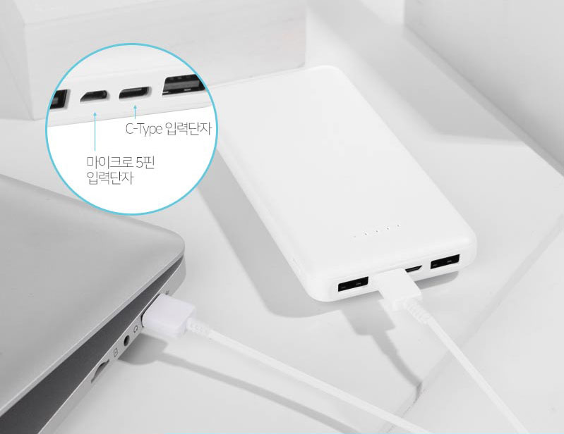 C-Type, Micro-5 Pin 두 개의 입력 단자로 PC나 노트북 어탭터에 연결해 충전이 가능하고 LED로 배터리 용량과 충전상태를 확인할 수 있습니다.