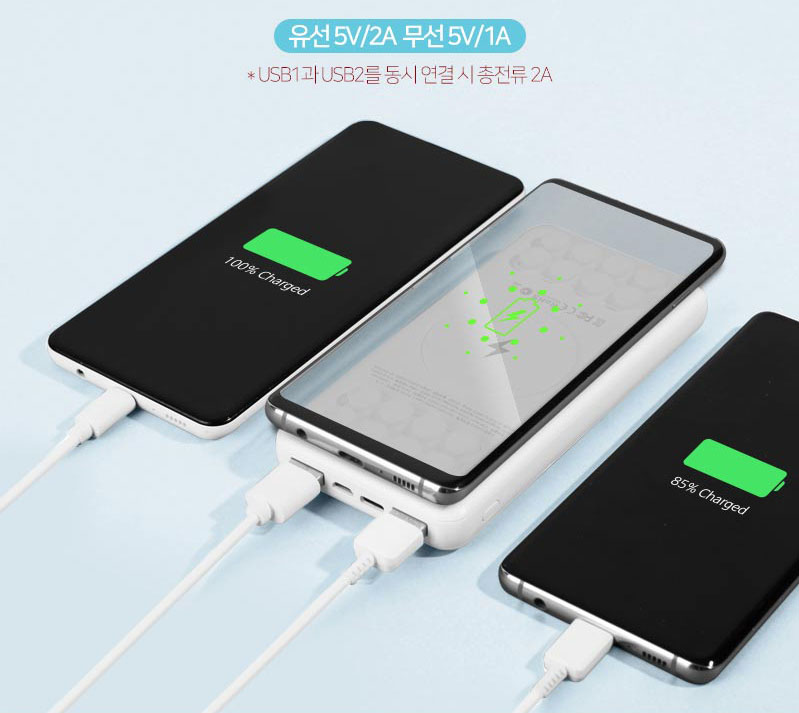 마이크로 5핀과 C타입 입력 단자를 선택해서 사용할 수 있으며, USB 충전 단자 또한 2개 있어 무선충전이 가능한 디바이스와 함께 최대 3개 디바이스를 동시에 충전하면서 보조배터리 자체 충전도 가능해 어떠한 환경에서도 최적의 디바이스 상태를 유지할 수 있도록 도와주는 신개념 멀티 유 ·무선 동시 충전 보조배터리입니다.