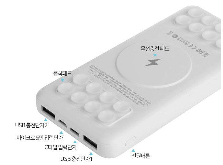 해외거래처 외국인 기업 브랜드 홍보 흡착식 무선충전 보조배터리는 2개의 유선 충전포트와 무선충전 패드를 제공해 3개의 디바이스를 동시에 충전이 가능한 유 ·무선 동시 충전 기능을 제공합니다.