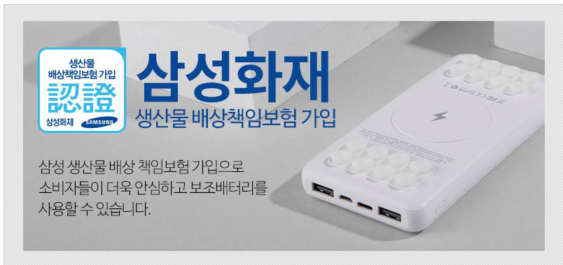 해외거래처 외국인 기업 브랜드 홍보 흡착식 무선충전 보조배터리는 소비자들이 더욱 안심하고 사용하실 수 있도록 삼성화재 생산물 배상책임보험에 가입되어 있습니다.