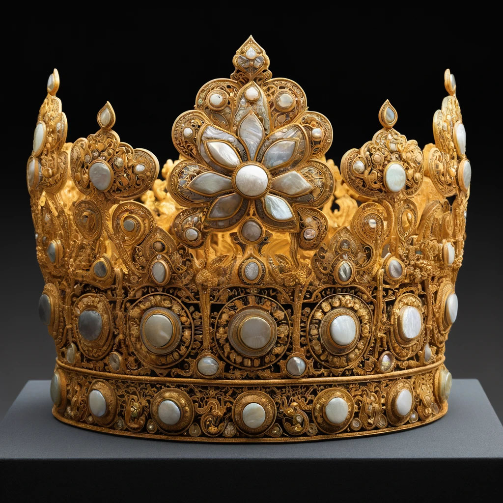- 설명: 신라 시대의 금관은 자개를 사용한 장식이 특징입니다. 신라 시대의 금속 가공 기술과 자개 세공 기술은 현대의 과학 기술로도 정확히 이해하기 어려울 만큼 정교합니다.