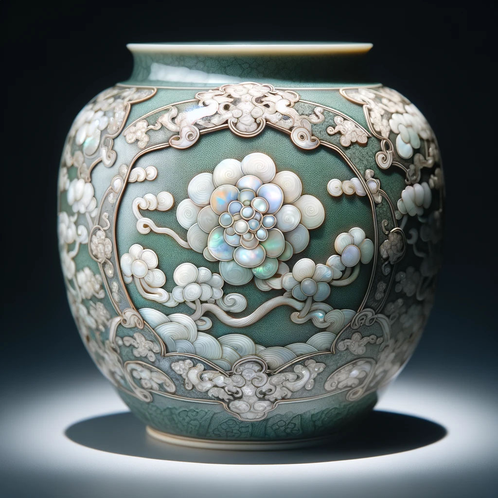 - 특징: 청자의 표면에 자개를 상감하여 넣은 문양은 매우 섬세하며, 자개 조각들이 일정한 패턴으로 완벽하게 배열되어 있습니다.