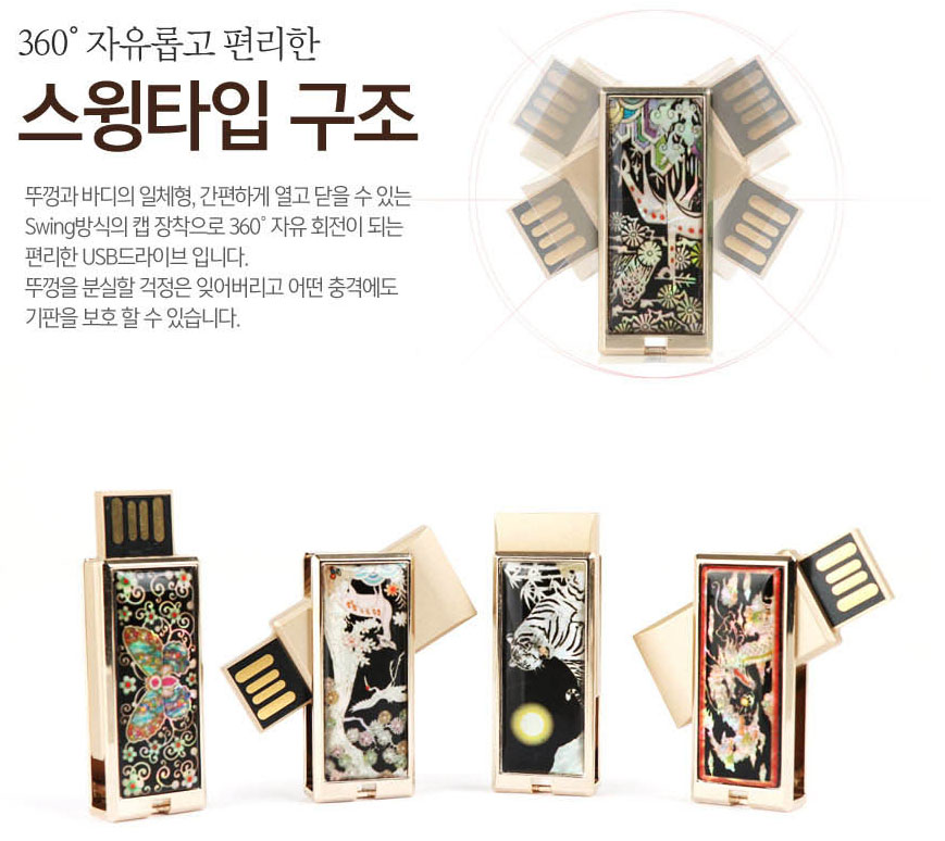 외국인 외국거래처 선물 홍보 판촉 기념품 한국전통자개는 은은하고 전통적인 멋이 물씬 느껴지는 오파츠 자개 USB 메모리로, 360도 스윙타입으로 뚜껑의 분실 없이 안전하고 쉽게 사용할 수 있습니다.