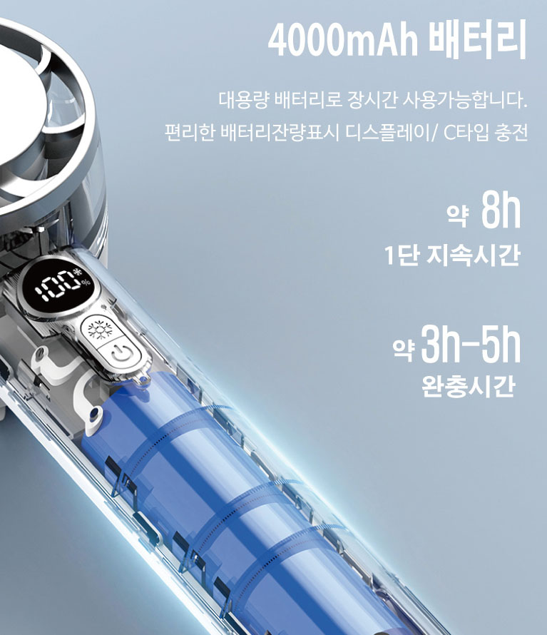여름 홍보물품 기념품 굿즈 쿨링 냉각 미니 선풍기 대용량 배터리는 4,000mAh로 1단으로 3~5시간 충전으로 약 8시간을 사용할 수 있어 외출이나 야외활동 시 충분한 사용시간을 제공합니다.