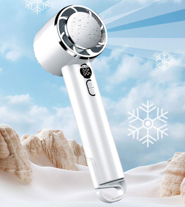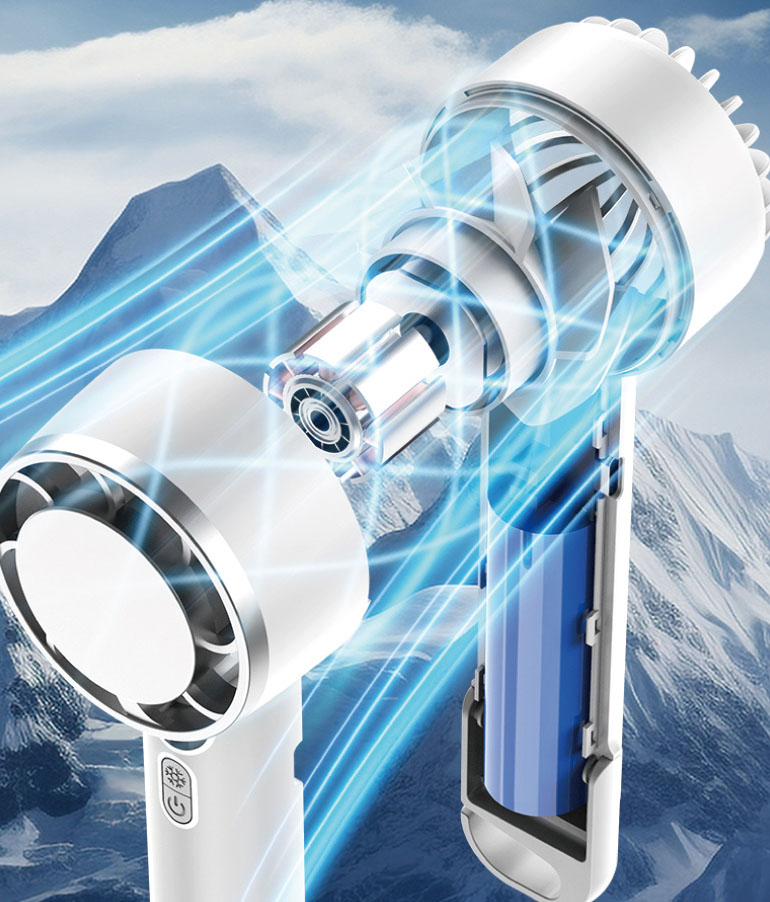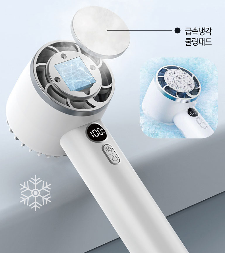 핸디형 냉각 쿨링 선풍기는 전면부에 쿨링 패드가 장착되어 있어, 냉각모드 버튼을 누르면 신속하게 패드가 냉각되고 그 주위를 도는 BLCD 고효율 반영구적 모터가 차가운 바람을 뿜어주는 급속 냉각 기능이 장착되어 있습니다.