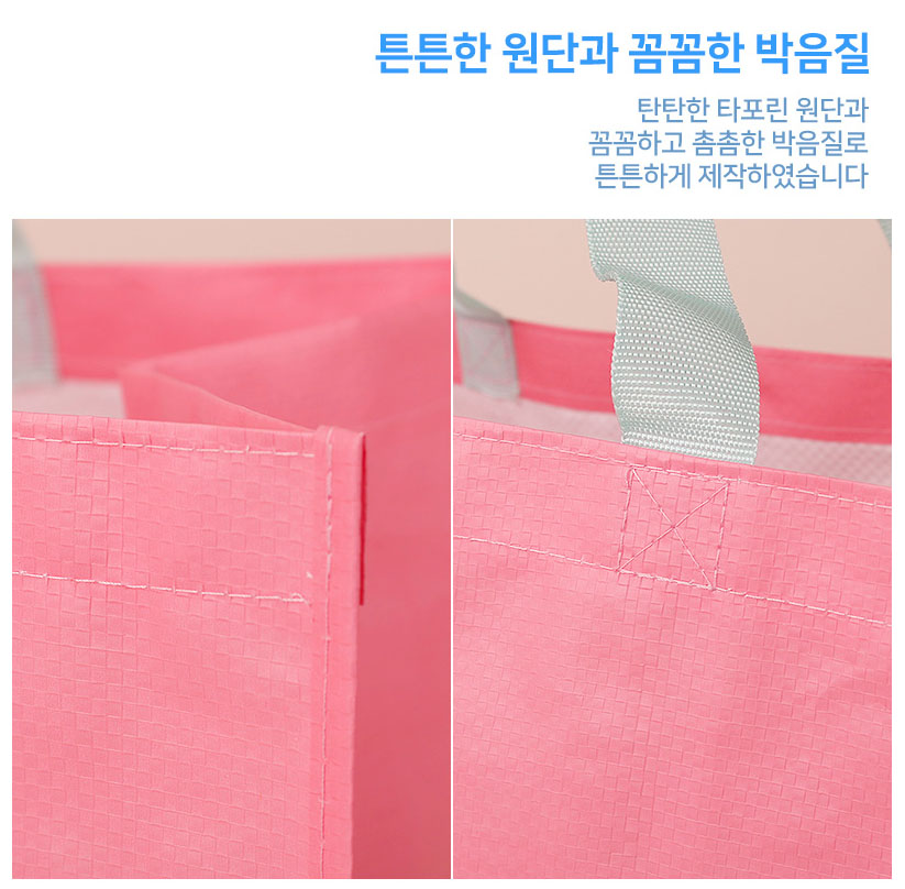 기존 홍보용 굿즈 타포린 가방에 비해 톤 다운된 파스텔 색상의 심플한 특대형 타포린 마트가방으로 튼튼한 원단과 꼼꼼한 박음질 그리고 넓은 밑면과 깊이감이 좋은 짱짱한 수납력이 장점입니다.