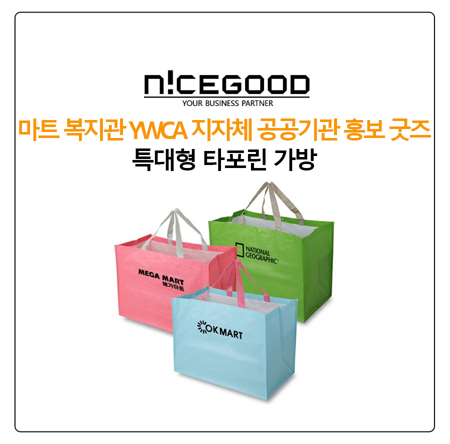 마트 복지관 YWCA 지자체 공공기관 홍보 굿즈 특대형 타포린 가방 디자인은 잡기 편한 적당한 길이의 손잡이와 함께 접이식 M자형 밑판으로 휴대와 보관이 용이한 빅사이즈 타포린 다용도 가방입니다.