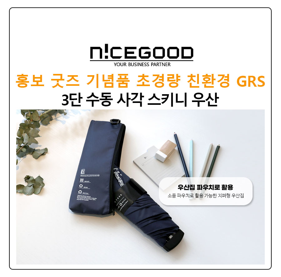 홍보 굿즈 기념품 초경량 친환경 GRS 3단 수동 사각 스키니 우산은 UV자외선차단 인증을 받은 제품으로 우산 뿐만 아니라 양산 겸용으로 사용이 편리하도록 개별 보관용 파우치에 가방 등에 결합이 가능한 고리까지 달려 있어 휴대성을 극대화한 제품입니다.
