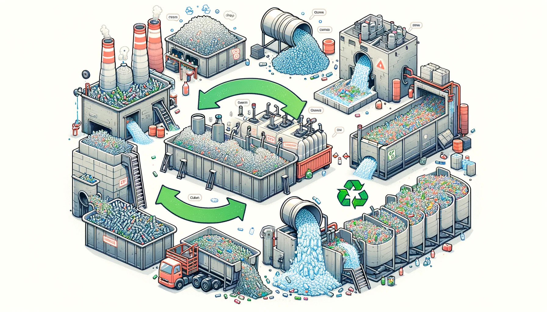 -수집 및 세척: 사용된 PET 병을 수집하여 세척합니다. 이 과정에서 불순물과 이물질을 제거합니다.