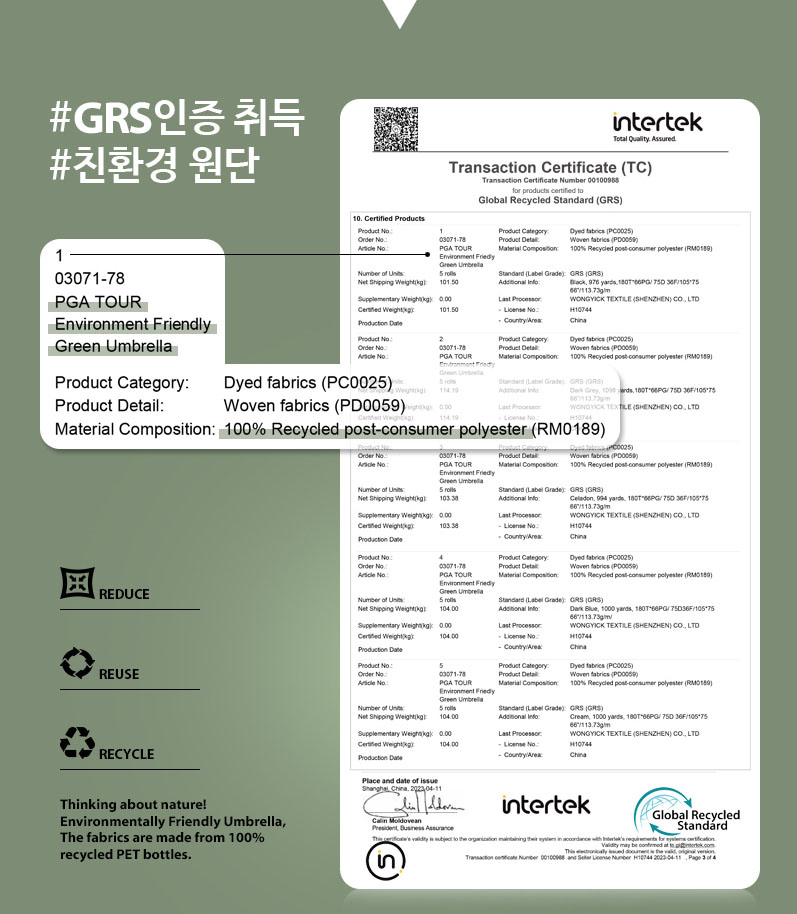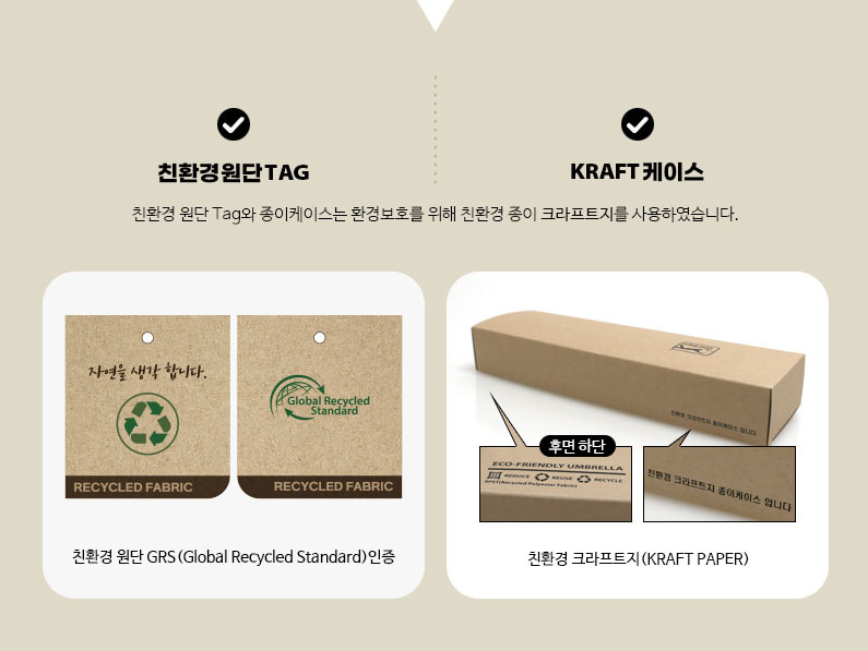 자연을 생각하고 글로벌 리사이클 스탠다드에 부합된 친환경 원단 인증 TAG와 친환경 크라프트지 박스에도 인증 관련 문구가 인쇄가 되어 있어 안심하고 믿고 선물하셔도 됩니다.