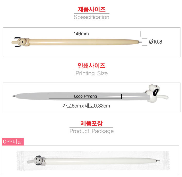 홍보 판촉 사은품 굿즈 국산 댕댕이 니들 볼펜 독일잉크 초초저점도 인쇄는 158mm의 다소 긴 볼펜 길이 답게 세로 60mm라는 넓은 인쇄 영역을 제공합니다.