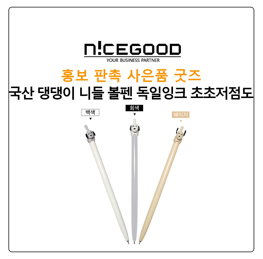 홍보 판촉 사은품 굿즈 국산 댕댕이 니들 볼펜 독일잉크 초초저점도 디자인은 귀여운 강아지 댕댕이를 적용한 디자인등록제품으로 댕댕이 귀를 세우거나 내릴 수 있고, 꼬리를 누르면 심이 나오는 니들(니들 포인트) 볼펜입니다.