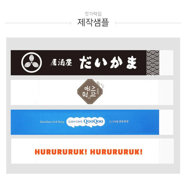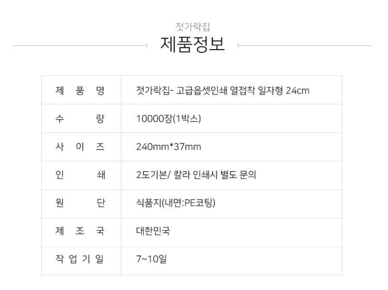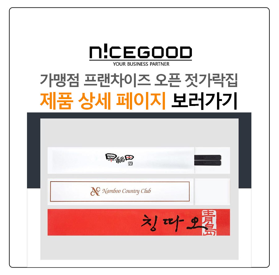 가맹점 프랜차이즈 오픈 젓가락집 고급 옵셋 인쇄 열접착 일자형은 24cm 제품이 1박스 1만개로 제작되는 주문제작형 홍보물품입니다.