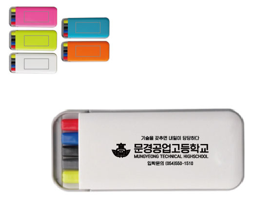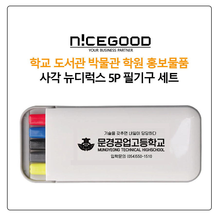 학교 도서관 박물관 학원 홍보물품 사각 뉴디럭스 5P 필기구 세트는 문경공업고등학교에서 의뢰를 주셨고, 견적부터 시안까지 한번에 확정되어 바로 900개를 진행한 건입니다.