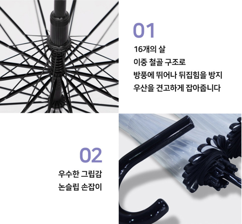 물론 몇몇 저가형 투명우산의 경우 8개의 살대와 튼튼하지 못한 마감으로, 일반 우산에 비해 수명이 짧아 파손 시 처리하는 것오 이만저만 불편한 것이 아닙니다.