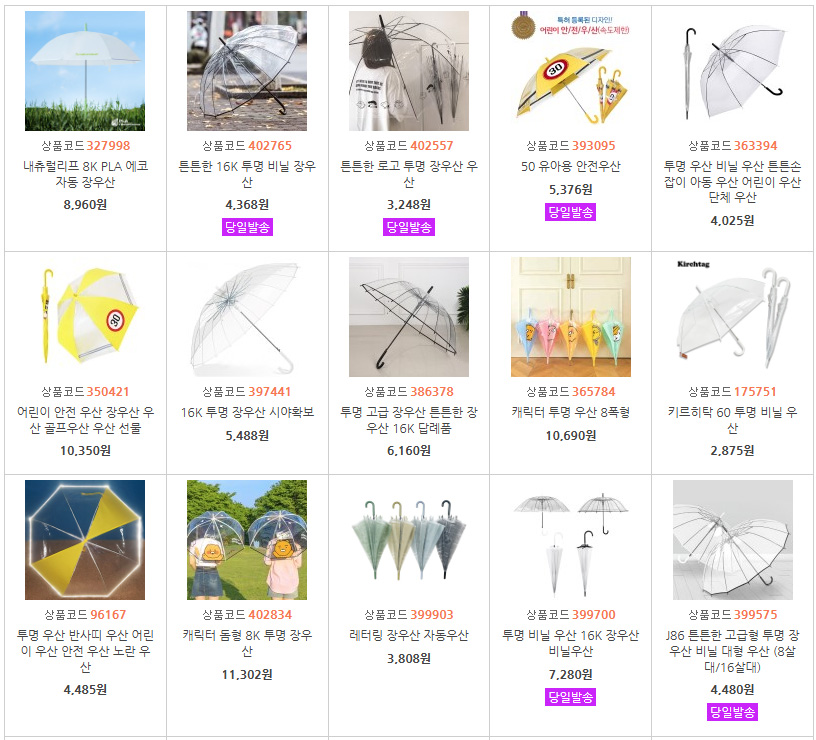 우산의 경우 일반적으로 1미터 이상이 넘는 폭이 기본적인 사이즈이며, 비를 막을 수 있도록 면적이 큰 아이템이어서, 색상과 디자인도 고려를 해야 합니다.