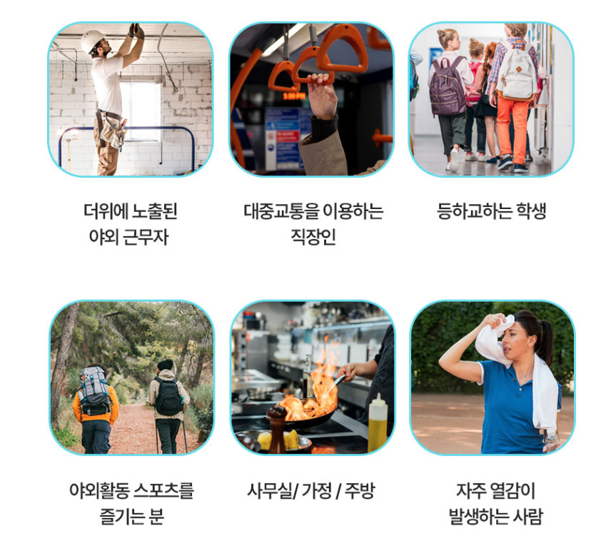 가성비 폭염 대비 홍보물품 아이스넥쿨러 필요한 환경으로는 더위에 노출된 야외 근무자나 현장근무자, 그리고 대중교통 이용 시, 등하교 학생, 야외활동이나 스포츠 또는 사무실, 학교, 가정, 주방이나 더위에 취약한 어르신과 평소 열감이 심한 분들께 적극 추천드리는 제품입니다.