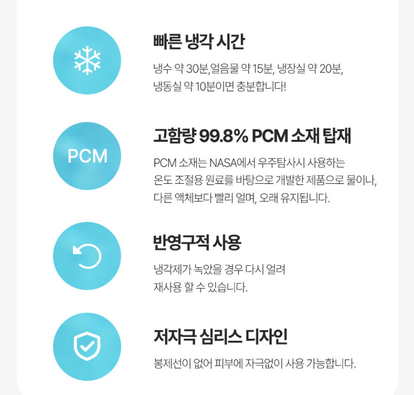 마지막으로 소개드릴 제품은 28도 이하 상온에서 자연냉각이 가능한 아이스넥쿨러 제품으로, 99.8%의 고함량 PCM 소재를 사용해 빠른 냉각과 장시간 온도 유지가 특장점인 제품입니다.