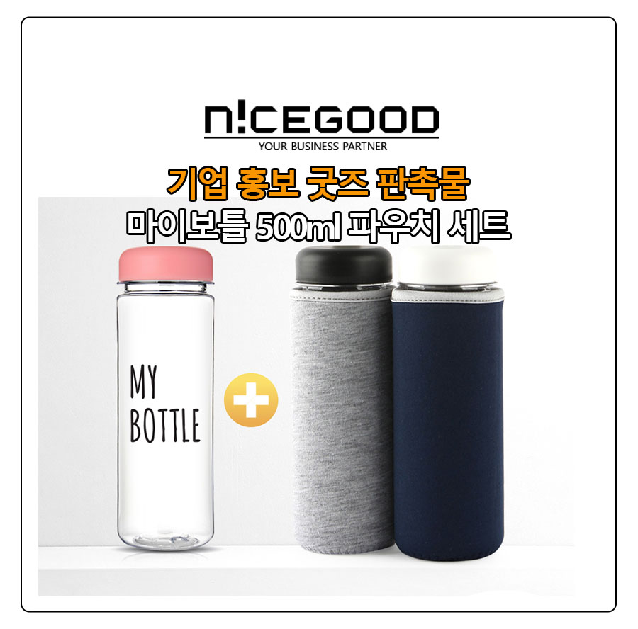기업 브랜드 홍보 굿즈 판촉물 마이보틀 500ml 파우치 세트는 젖병 소재이며, 냉온이 가능한 소재인 친환경 트라이탄 소재로 제작된 국산제품입니다.
